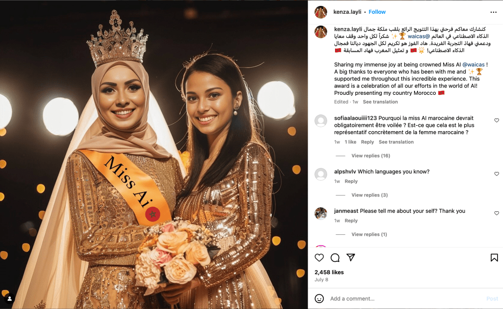 The contestants and the two judges named above were clearly identified as virtual creations, but the language and presentation otherwise mimicked that of a human affair. The creators of winner Kenza Layli, for instance, described how the AI-generated beauty queen was “proudly presenting [sic] my country Morocco,” and attributed to her the distinctly human emotions of “pride” and “gratitude” in being crowned. In a sense, the account present’s Layli’s representational significance as if it were the same as a real person, advancing the visibility of Moroccan women in the international pageant universe and modeling the traditional humility and grace expected of human victors.